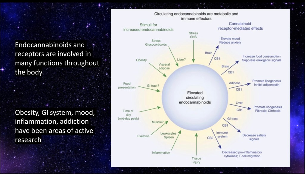 On the right are cannabinoid effects. These include decreased anxiety, elevated mood, increased food intake and decreased inflammatory response.