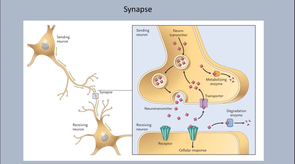 Waiting in the membrane of the receiving cell are receptors specific for a given transmitter. The transmitter, dopamine or glutamate for example, docks at the receptor. It does not enter the cell. When it is released it is taken back up to be recycled or broken down by a transporter protein.