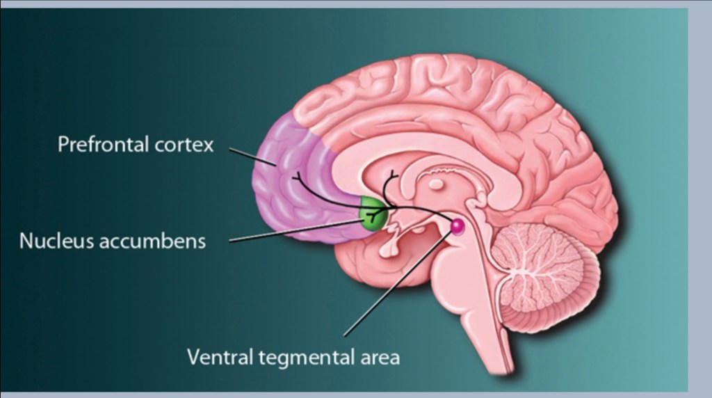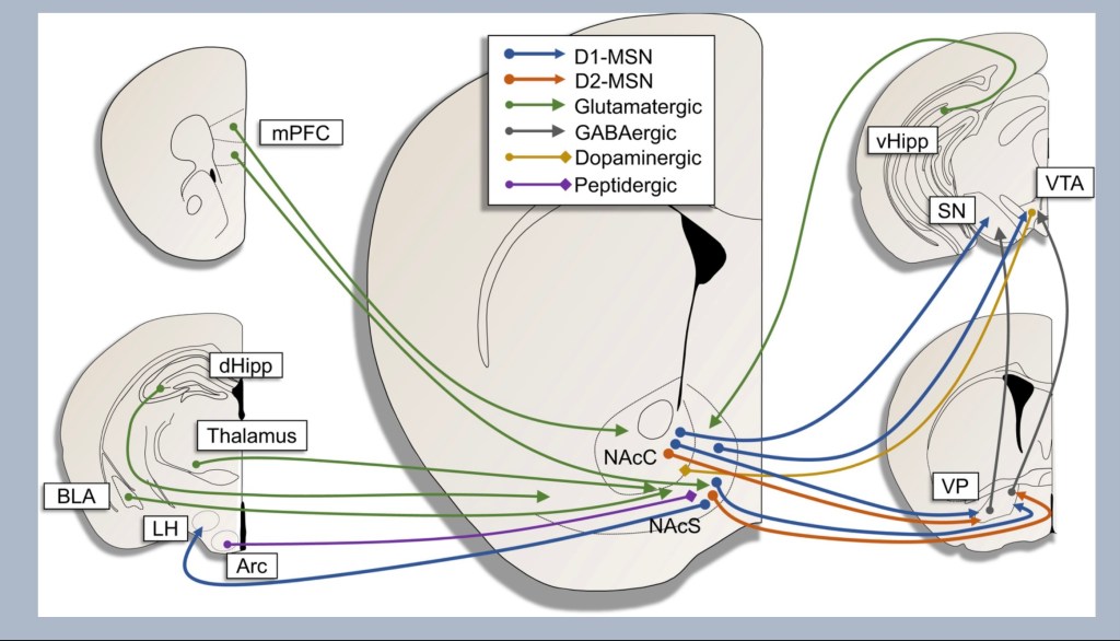 If the reward pathway is a one way street the nucleus accumbens is the Dallas-Ft.Worth airport. This is a central crossroads and a very busy crowded focal point. The NAC is where signals from various parts of the brain meet and are processed.