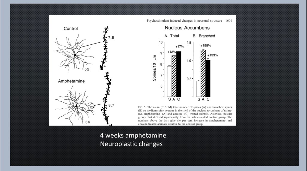 As shown above the test subjects demonstrated fewer D2 receptors compared to controls even without the drug present. This same finding occurs despite entirely different mechanisms of action of these addictive drugs. Additional imaging has demonstrated partial to complete receptor recovery within about 2 years of abstinence.