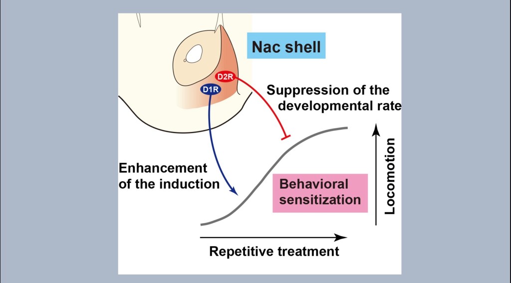 The diagram illustrates the effect of shift to D1 predominance. With repetitive treatment using the same dose observed locomotor activity such as multiple lever presses to receive reward increases. This effect increases with D1 predominance and decreases with D2 predominance.