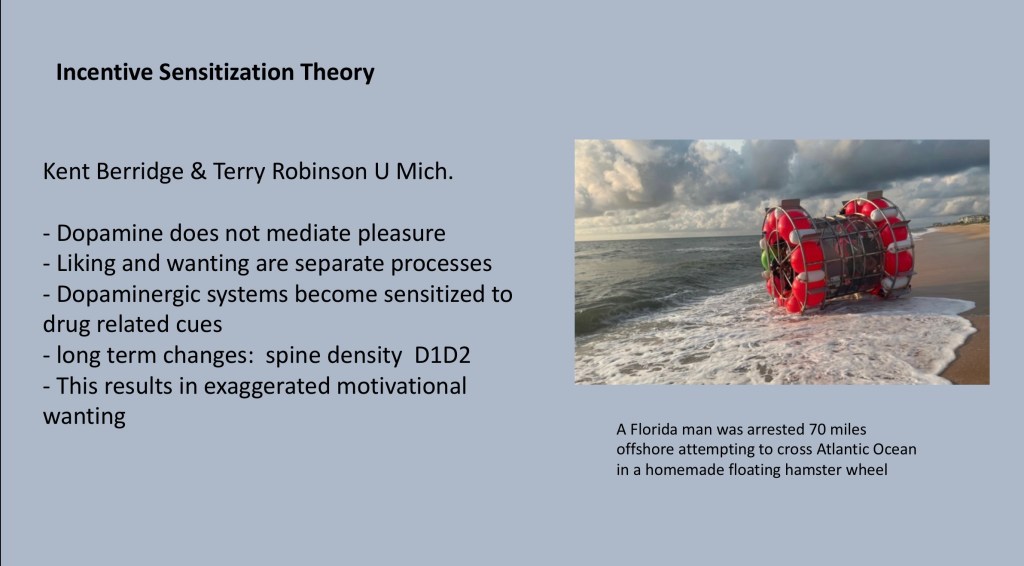 This post focuses on the incentive sensitization model. It has been primarily developed by Kent Berridge and Terry Robinson in their labs at University of Michigan. It explains heightened motivational behavior in response to drug related cues and explains drug cravings and risk of relapse following detoxification.