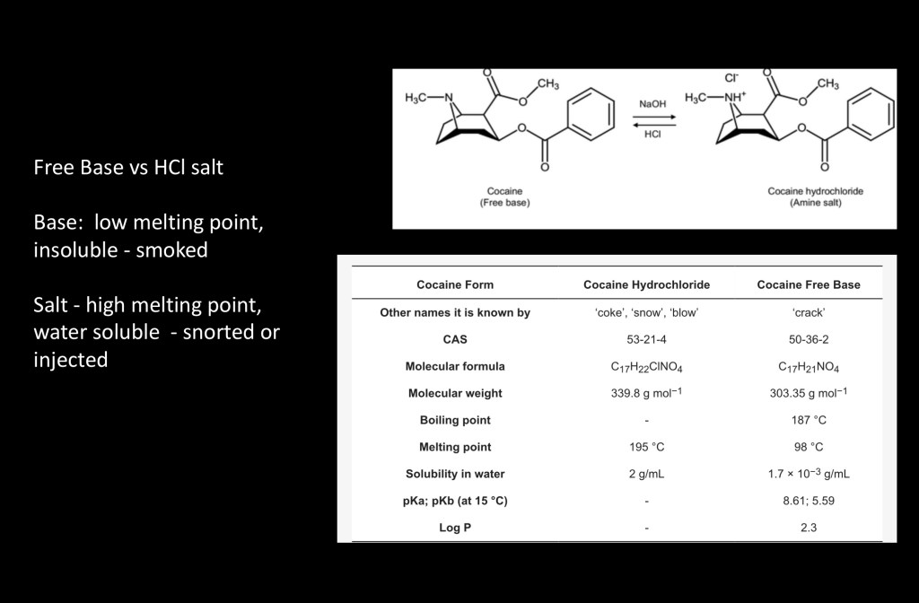 Cocaine may be present in one of two forms. The salt, cocaine hydrochloride is highly water soluble. It has a high melting point and cannot be smoked as the high temperature needed destroys the compound. In this form it is either taken by nasal insufflation (snorted) or intravenous injection. Oral use is inefficient.