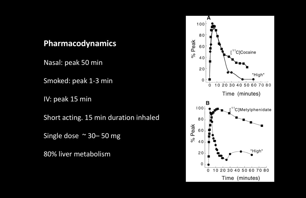 These experiments conducted at the NIH compared levels of cocaine and methylphenidate (Ritalin) administered intravenously with subjective high. Both result in high dopamine levels. Note that the lower graph, methylphenidate has longer duration in the bloodstream yet the subjective rating falls dramatically after the peak.