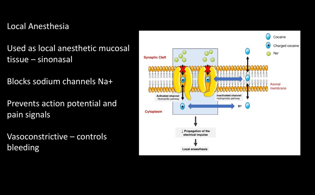 Medicinal use includes local anesthesia primarily in sinonasal procedures as it is readily absorbed through mucosal tissues. It also results in vasoconstriction and reduced bleeding. As there are more effective agents it is rarely used today. Due to vasoconstriction chronic nasal use can result in tissue necrosis and septal perforation.