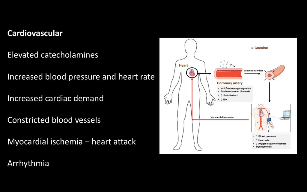 At the same time cocaine results in higher blood levels of catecholamines, the ‘flight or fight’ hormones. This results in increased blood pressure and heart rate. The heart is working harder and at the same time it is getting less blood and oxygen.