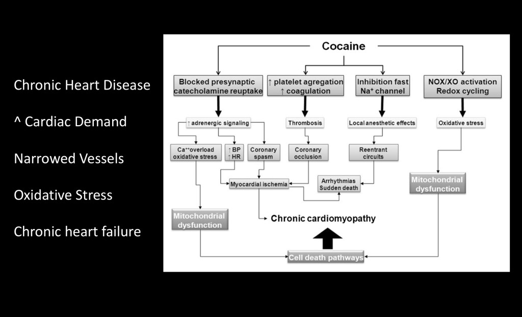 This flow chart illustrates the effects of chronic cocaine use on the heart. By a number of mechanisms the heart muscle is subject to insufficient tissue oxygenation to meet demand resulting in progressively weaker tissue. Metabolic abnormalities result in insufficient energy production by mitochondria. Eventually this can result in irreversible chronic heart failure.