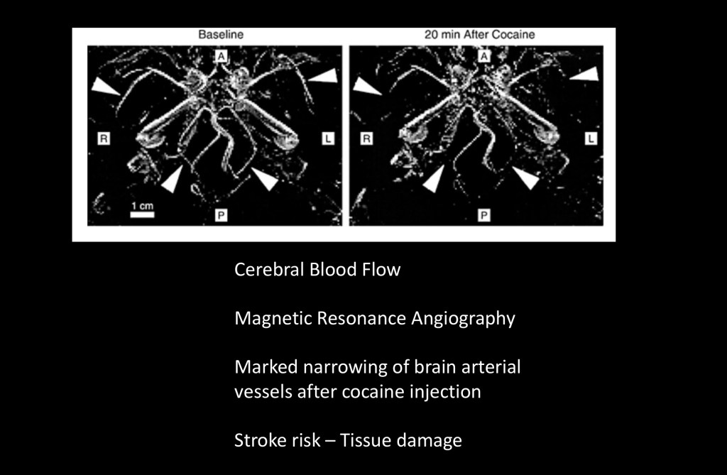 Normal circulation is on the left. Focus on the arrowheads compared to the image on the right obtained 20 minutes after cocaine injection. The severely narrowed or absent structures are arteries supplying the brain, the PCA and MCA branches. Decreased flow carries risk of clot formation in affected arteries.