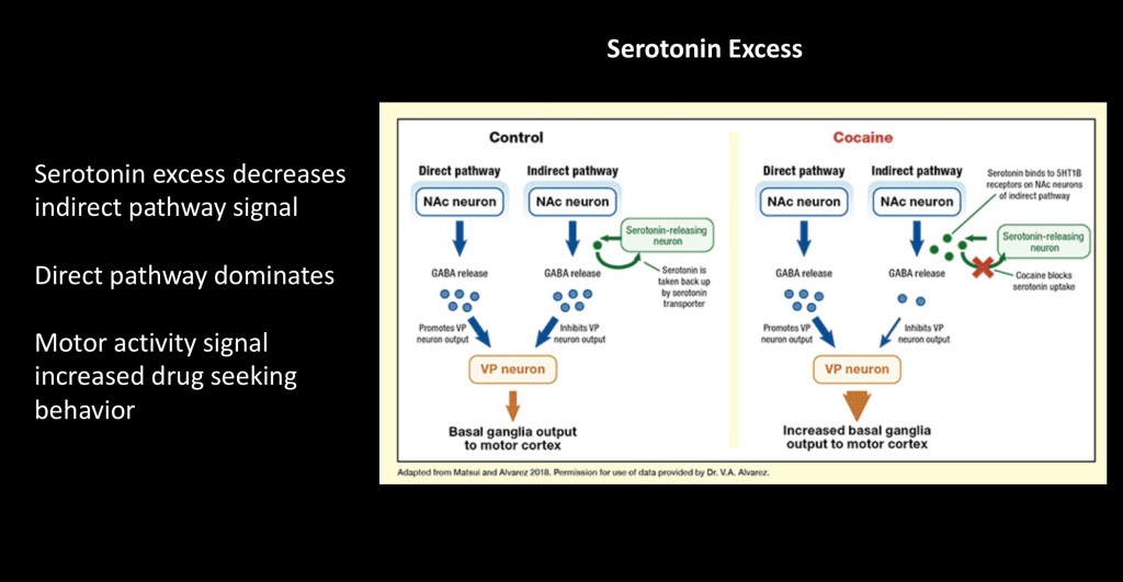The indirect and direct pathways balance each other in the normal state. Excess serotonin inhibits the indirect pathway resulting in increased signal from the direct pathway affecting motor movement. This is thought to be important in initiating drug seeking behavior.