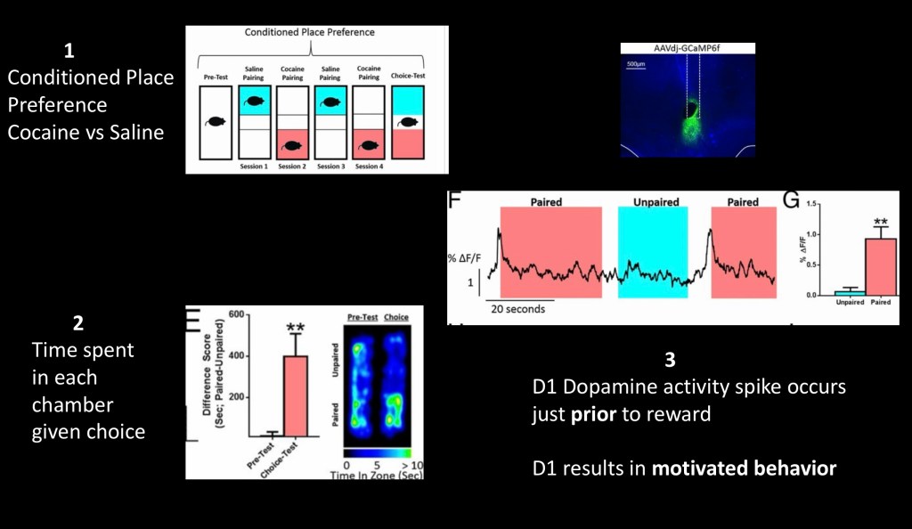 This series of experiments combined the above techniques to further explore the role of dopamine receptor subtypes in addictive behavioral motivation. There are two types of dopamine receptors D1 and D2. This specifically looked at D1 receptors.