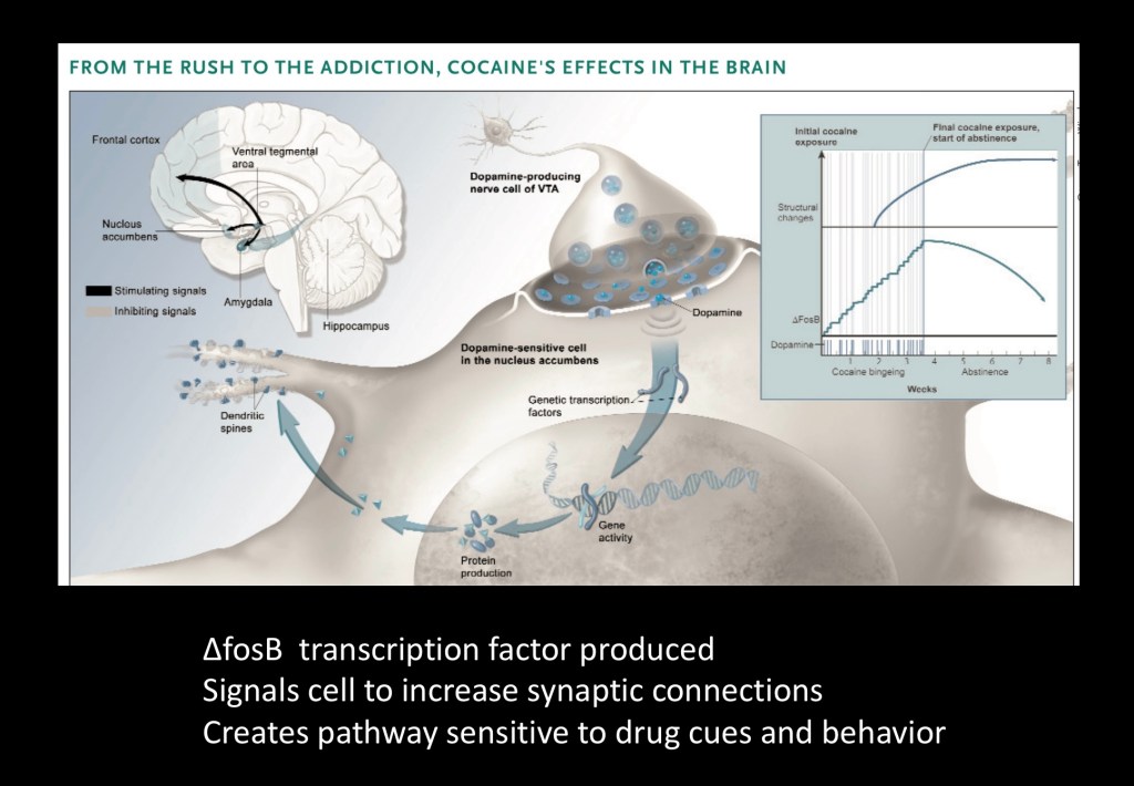 The above diagram represents a neuron in the nucleus accumbens receiving a dopamine signal. This activates a gene producing the regulatory protein ΔfosB. This protein activates other genes causing the cell to grow new dendrites and synaptic connections. The graphs in the upper right show that this process continues after the drug is discontinued. So addictive drugs create new pathways in the brain which persist after detox and into recovery.