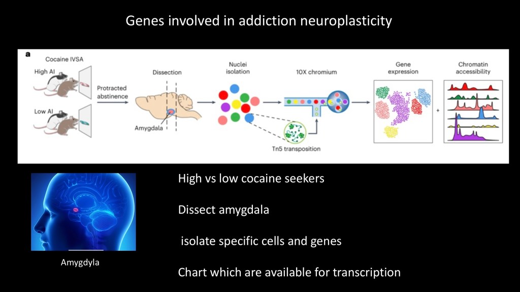 Rats bred for high and low drug seeking behavior were used. Following cocaine administration and abstinence. DNA obtained from the amygdala was separated for analysis. The amygdyla is well known to have a key role in addiction pathology.