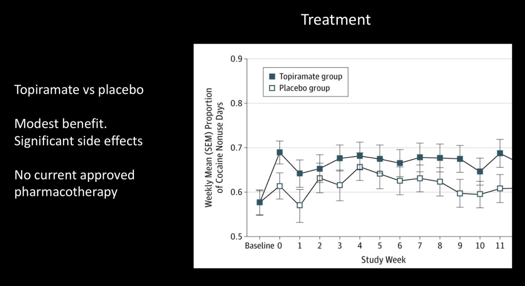A number of medications have been studied as potentially therapeutic in treatment of cocaine addiction. This placebo controlled study looked at Topiramate, a GABA acting agent used in epilepsy and for migraine prevention. Standard psychotherapy was also provided. Modest improvement was noted in the topiramate group. Given potential side effects it has not been adapted for clinical use.