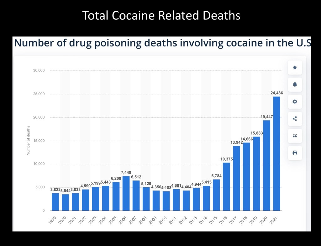 The majority of cocaine related deaths involve multi drug use particularly added fentanyl which accounts for the majority of drug overdoses and deaths since about 2014.