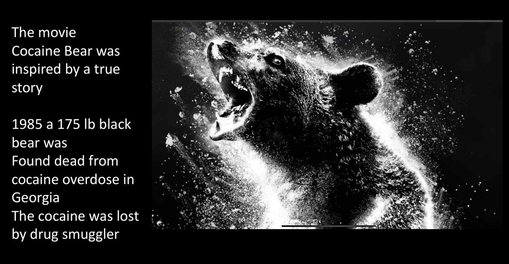 The movie Cocaine Bear is loosely based on a true story. In 1985 in a national forest in northern Georgia a deceased 175lb black bear was found by a hiker. Evidence at the scene and post mortem toxicology concluded that the bear had died of cocaine overdose presumably lost by smugglers or dropped from a plane.