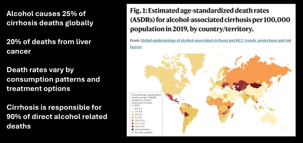 Alcohol use patterns and mortality secondary to cirrhosis vary in geographic distribution. Availability of medical treatment and diagnosis influences disease and survival rates. Approximately 20% of cases of hepatocellular carcinoma are secondary to alcohol related liver disease (ALD). Cirrhosis is the leading direct cause of alcohol related deaths.