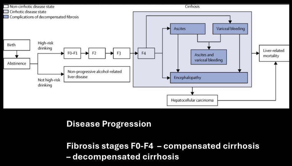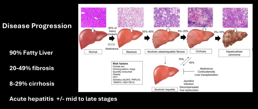 ALD is a progressive disease increasing in severity with chronic alcohol exposure. About 90% of heavy alcohol drinkers, defined as 40-60 grams per day, will develop hepatic Steatosis (fatty liver). Between 20-40% of these will develop fibrotic scarring of the liver. Between 8-20% will progress to cirrhosis which may be compensated or decompensated and 3-10% will develop hepatocellular carcinoma.