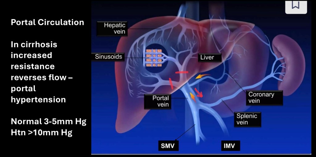 The portal system is low pressure normally 3-5mm Hg. Portal hypertension is defined as a pressure greater or equal to 10mm Hg