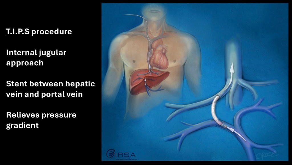 T,I.P.S. Procedure may be used in some patients to lower portal pressure and prevent further disease progression. Transjugular Intrahepatic Portal Systemic Shunt involves introduction of a catheter down from the internal jugular vein into an intrahepatic systemic vein in the liver. A channel is then formed from the hepatic vein into a neighboring portal vein and an artificial metallic shunt tube is placed.