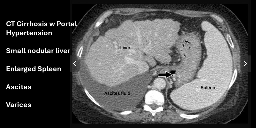 This is a CT scan of the upper abdomen following IV contrast in an individual with cirrhosis. To the left on the image (anatomic right) the liver is smaller than normal. The liver has a nodular contour. The margins are normally smooth. This is due to scar tissue and volume loss.