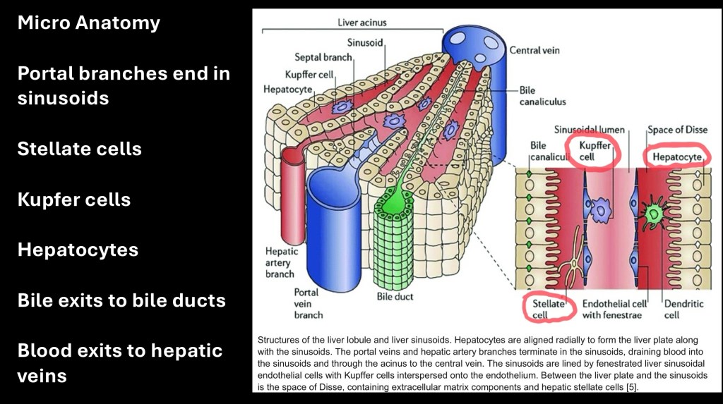 Sinusoids are the smallest terminal branches. They are lined by epithelial cells, kupffer cells, and stellate cells. Each of these are damaged by alcohol and contribute to ALD. Sinusoids are surrounded by sheets of hepatocytes which are the principle functional cells in the liver. Blood flowing out drains through the hepatic veins into the systemic circulation.