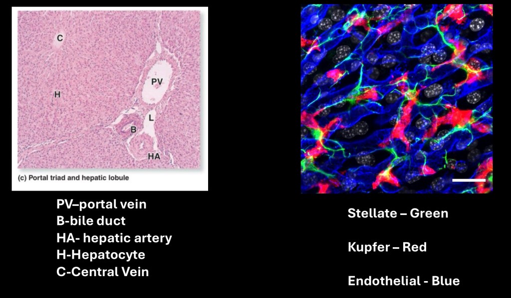 On the right are fluorescent labeled Stellate cells (green), kupffer cells (red) and Endothelial cells (blue). These line the sinusoids and are further discussed below.