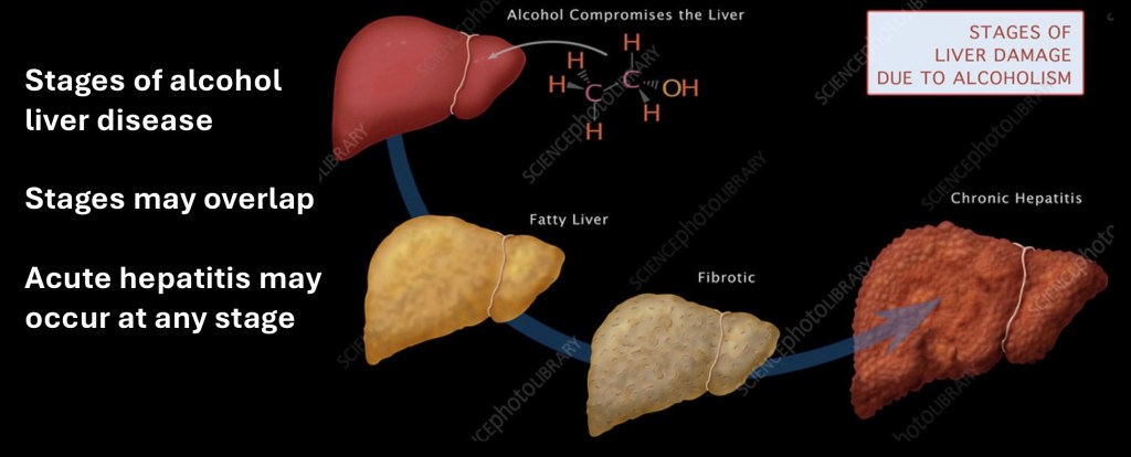 Chronic Alcohol Liver disease follows a predictable pattern from normal to fatty liver and then to increasing degrees of fibrosis, inflammation and cirrhosis. Acute hepatitis is an inflammatory condition which may occur in different stages of ALD.
