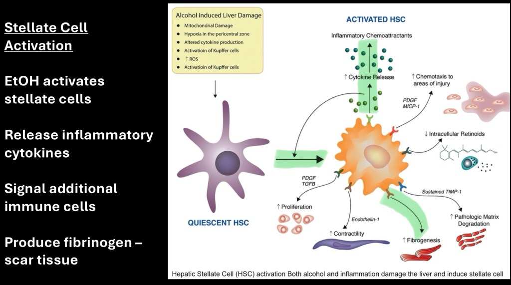 Stellate cells (SC) line hepatic sinusoids. Normally these cells are quiescent and function in retinol storage and a few other activities. Chronic alcohol exposure activates these cells. In the activated state SCs proliferate. They produce fibrin which coalesces into scar tissue. SCs produce cytokines recruiting inflammatory cells and reactions.