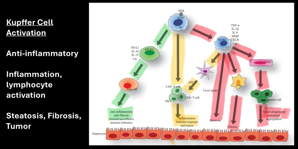 Shown in green KCs act in an anti-inflammatory capacity. They decrease fibrin accumulation and function in tumor surveillance.