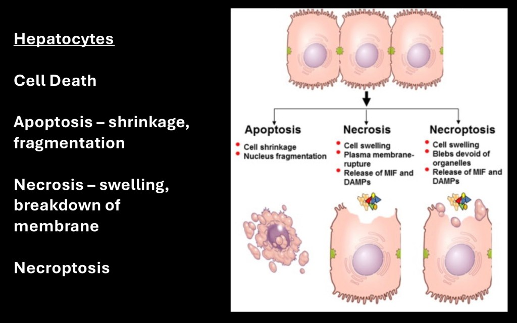 Necrosis refers to a process whereby the cell swells. The membrane becomes disrupted releasing cell contents into the extra cellular space. In necropoptosis cellular swelling and fragmentation both occur. In each of these processes the result is cellular destruction and loss of functional liver tissue.