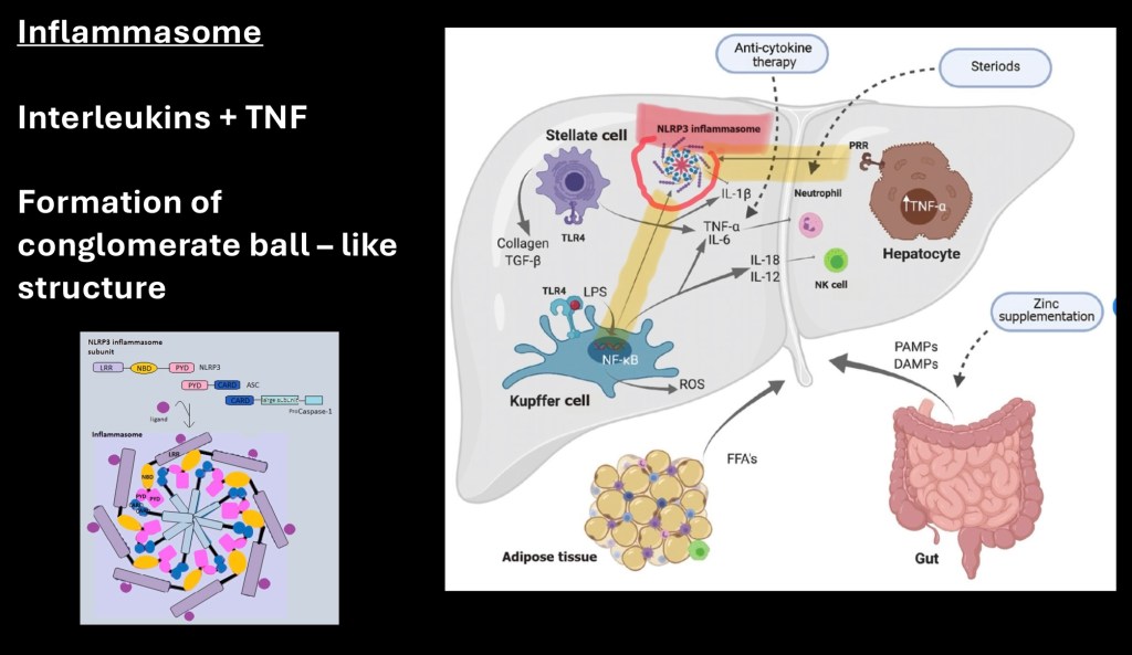 Inflammasomes are conglomerate proteins and inflammatory factors forming a ball-like structure seen in advanced ALD. These are a result of combined cytokines and interleukins along with cellular contents furthering destructive cell processes.