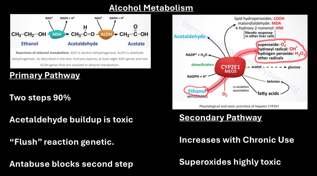 Acetylaldehyde is toxic and can build up resulting in cellular toxicity. There are genetic variants of the two enzymes involved ADH and ALDH some of which are less efficient leading to individual variation in levels of circulating alcohol and acetylaldehyde.