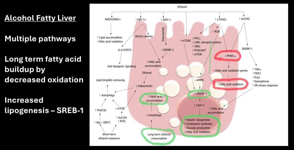 Fatty accumulation in the liver is the result of multiple metabolic changes. One is by increase in lipogenesis, increased fatty acid and glucose production. In addition there is decrease in normal oxidation of fatty acids. The result is buildup of intracellular fats.