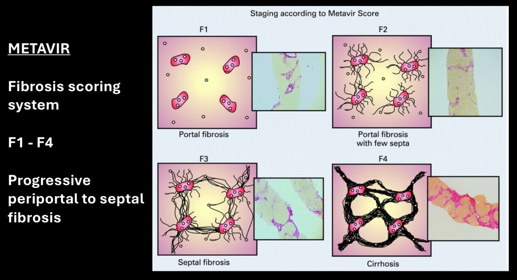 METAVIR is a grading system for fibrosis and cirrhosis based on histologic features on liver biopsy. F0 is normal and changes are graded to F4 cirrhosis. Fibrotic changes are first seen in the peri portal region. Later fibrosis occurs in the septa around cells with markedly thickened fibrosis and cell destruction in later disease.