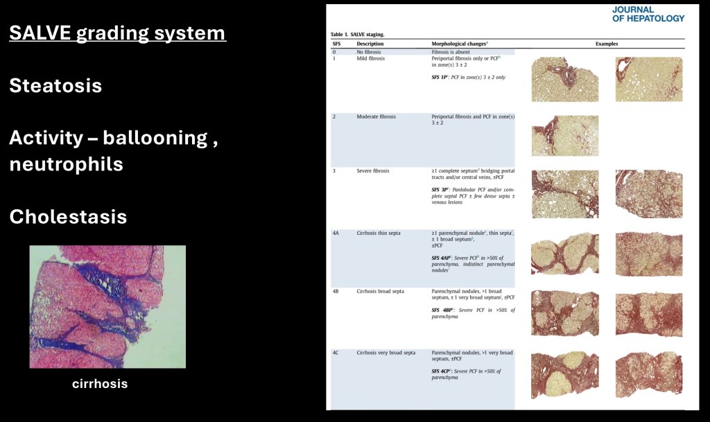 A number of prognostic grading systems have been developed. The SALVE histopathologic grading system was developed in Europe. In addition to fibrotic changes it incorporates fatty liver changes and inflammatory cells to come up with a more comprehensive risk and prognostic indicator.