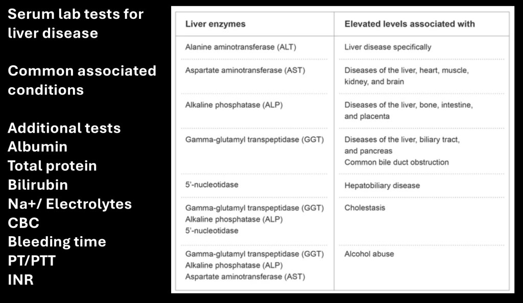 Additional tests include CBC (complete blood count), coagulation tests (PT, PTT, INR international normalization ratio) electrolytes (Na+, K+, Cl-,Ca++) Albumin and total protein, and bilirubin.