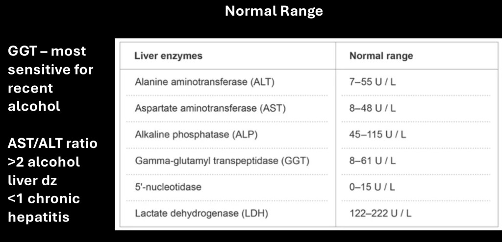 Serum blood tests are a routine essential component in diagnosis of ALD. Treatment options including indications for transplant are guided by lab values. These are often combined in a standard liver panel. Common serum levels are listed above along with relevant clinical significance.