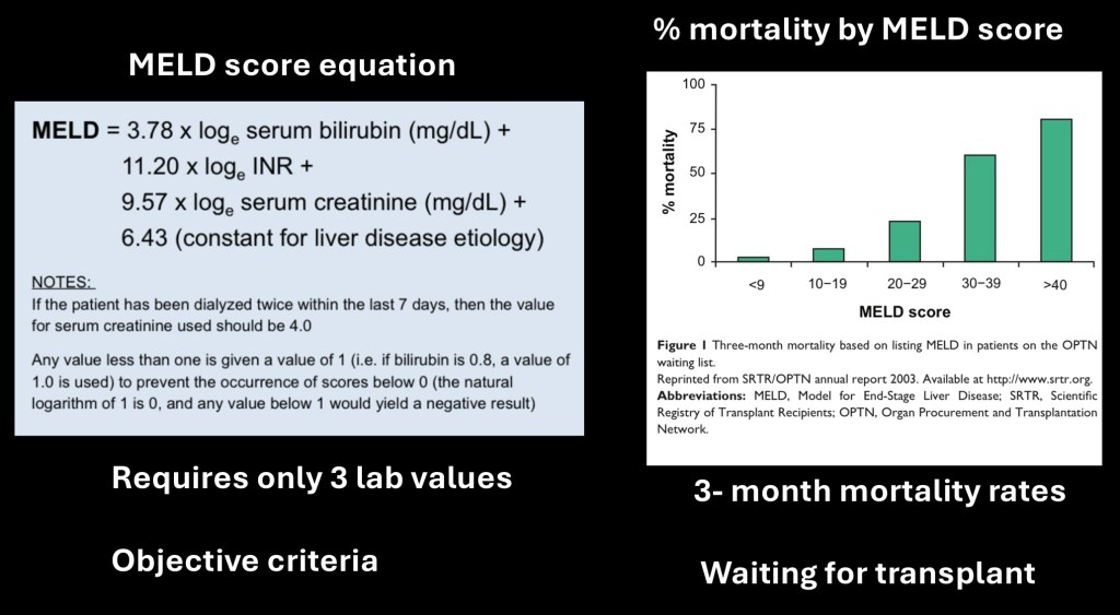 The chart on the right shows expected 3 month mortality by MELD score.