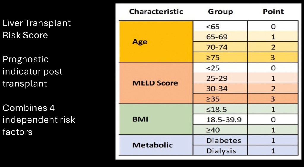 The LTRS scoring system above has been developed to assess post transplant prognosis. In addition to MELD score it includes age, body mass index, and diabetes status.