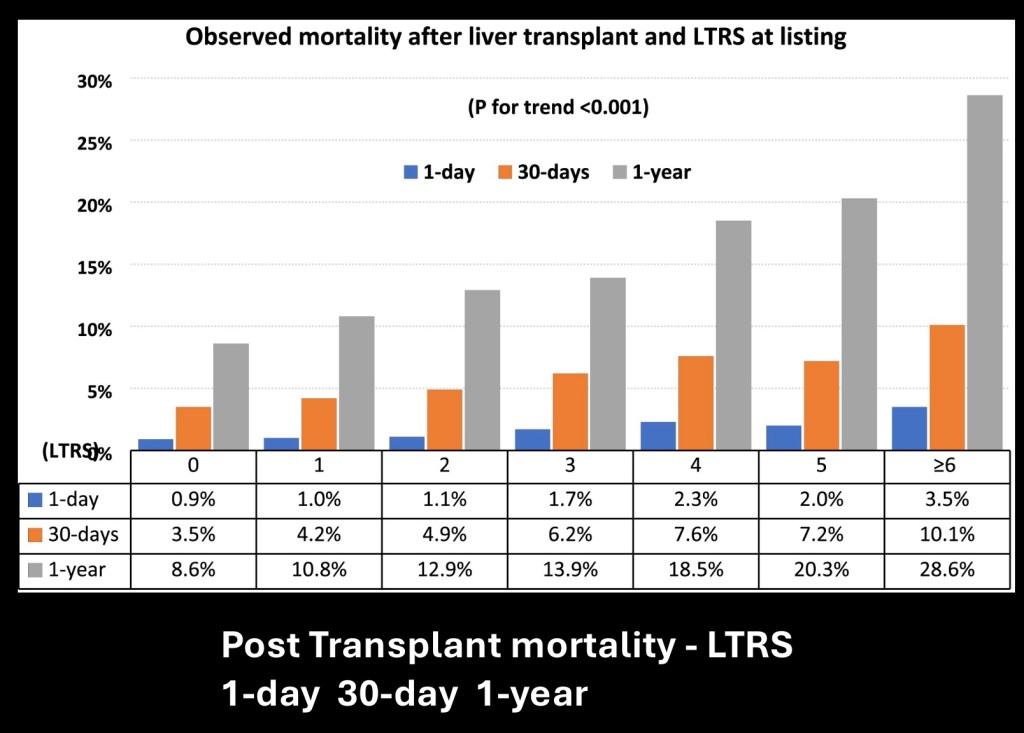 This chart shows expected mortality post transplant using LTRS scoring. Data are given for 1- day, 30-day, and 1-year. Scoring is from zero to six or greater.