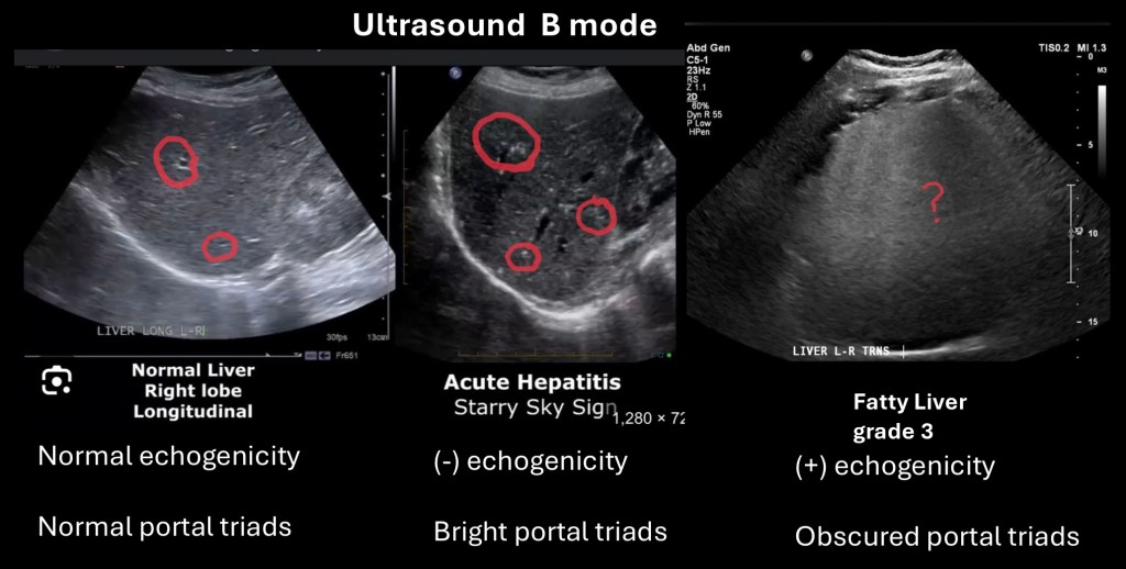 The “starry sky” appearance is when the liver becomes hypoechoic and bright portal triads appear more prominent. It is thought to be associated with acute hepatitis. However this sign has been shown to have low specificity and sensitivity. Ultrasound has high value in identifying presence of gallstones, dilated bile ducts, spleen size, most cysts or masses, and presence of ascites.