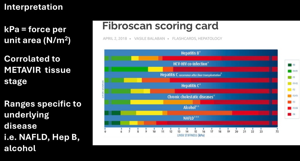 The derived measurement has been compared with biopsy findings to correlate with fibrotic METAVIR stages for differing liver pathologies such as alcohol, hepatitis B, and other causes. The result is a non invasive method to determine fibrotic change due to liver disease.