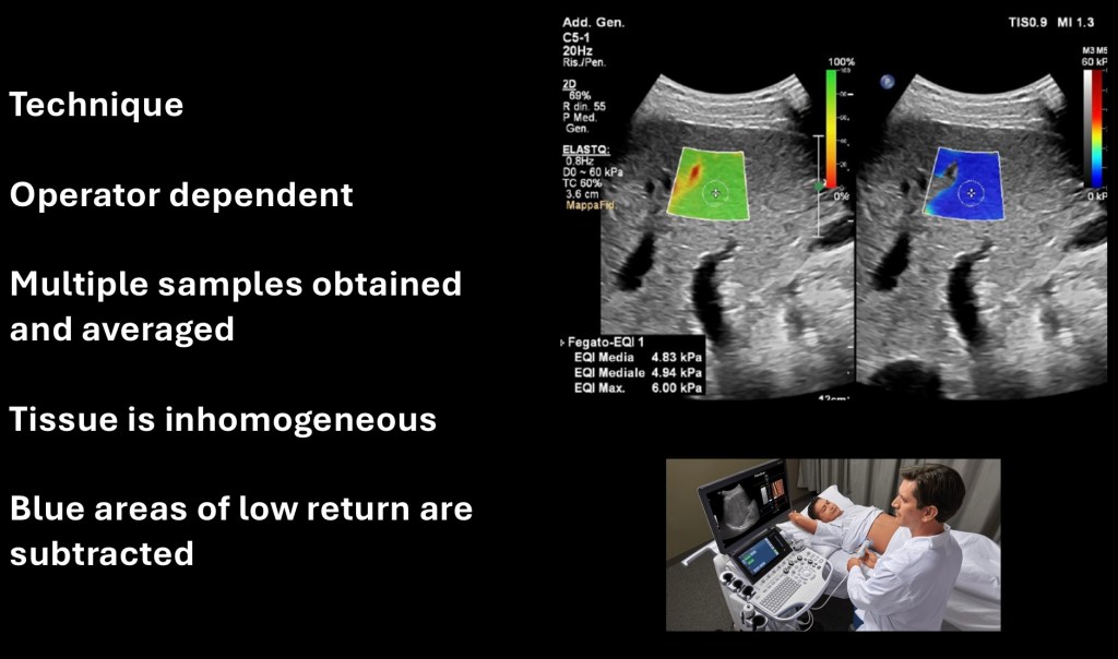 Imaging is a key component for evaluation of liver disease. Standard B-mode ultrasound is qualitative rather than quantitative. It is operator dependent and interpretation is largely subjective. It has the advantage of lower cost and no ionizing radiation compared to MRI or CT.