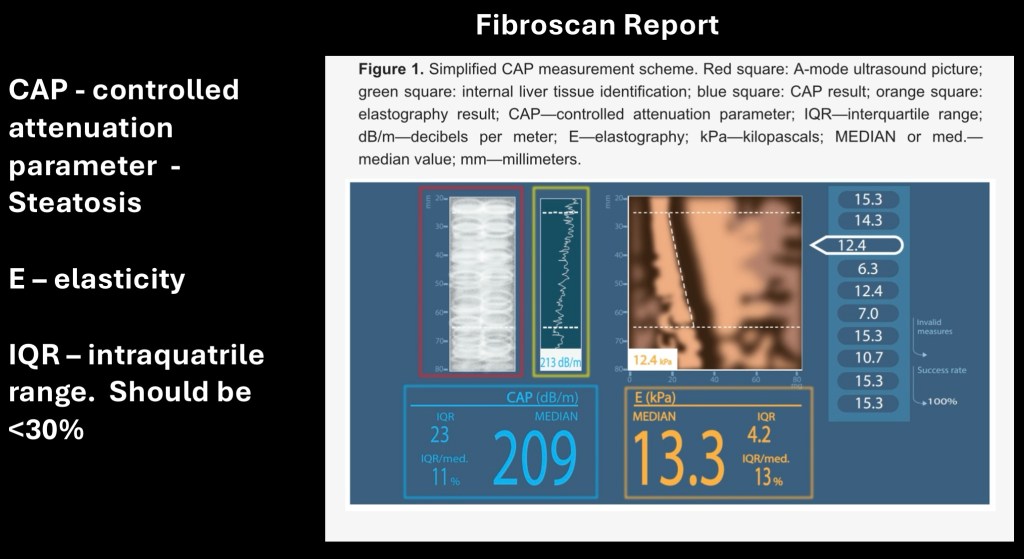 A sample Fibroscan report. The orange box is the stiffness measurement to be correlated with known values corresponding to fibrotic stage. The blue box is the controlled attenuation parameter (CAP) representing grade of fatty change present.