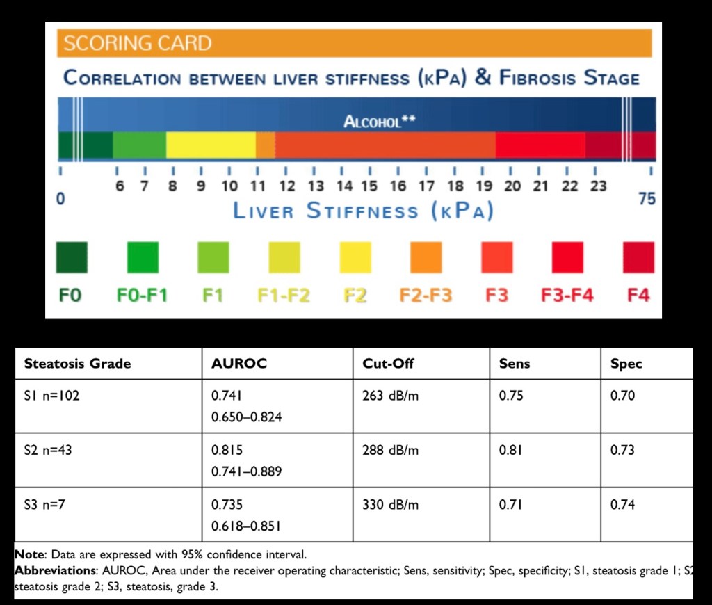 The topmost scale represents fibrosis stage and stiffness measurement for alcohol liver disease. The table at the bottom indicates sensitivity and specificity of CAP Steatosis grade obtained from Fibroscan. Results from other equipment manufacturers may differ and may not be directly comparable.