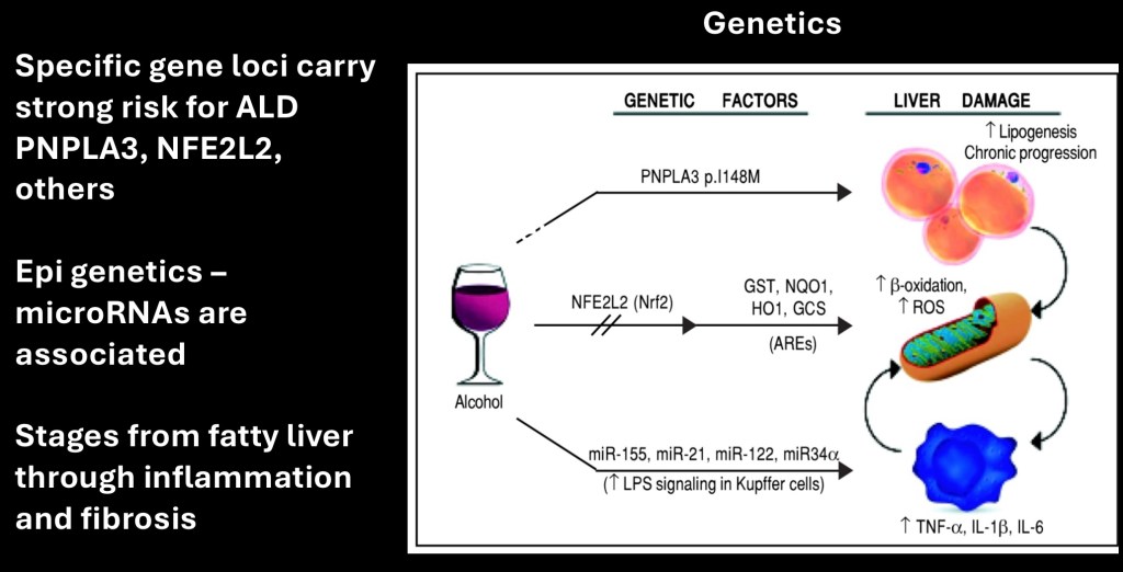 Genetic and epigenetic factors have been demonstrated to have a role in development of ALD. Variant versions of the PNPLA3 gene and others are linked to cirrhosis. Micro RNA epigenetic mechanisms play a role in disease progression. These are thought to participate in Kupffer cell activation and lipopolysaccharide signaling.