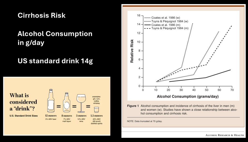The graph on the right shows relative risk of ALD at different daily consumption levels. Risk sharply increases at 40g/day. A standard US drink is considered to contain 14 grams of alcohol. Equivalents for different beverages are shown on the left. Time to disease onset is variable. Ten years of heavy drinking would be an approximate estimate.