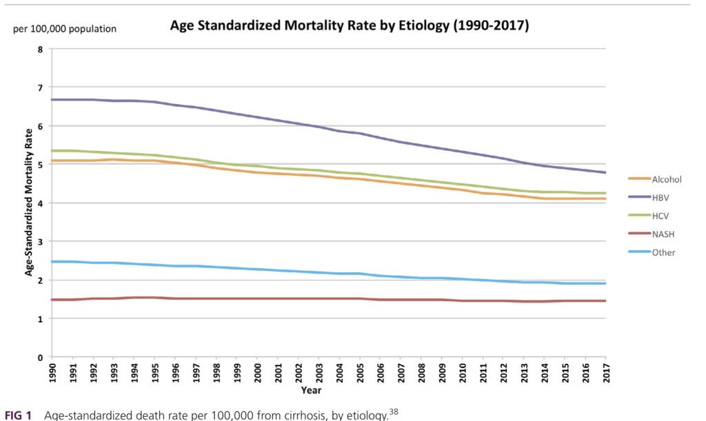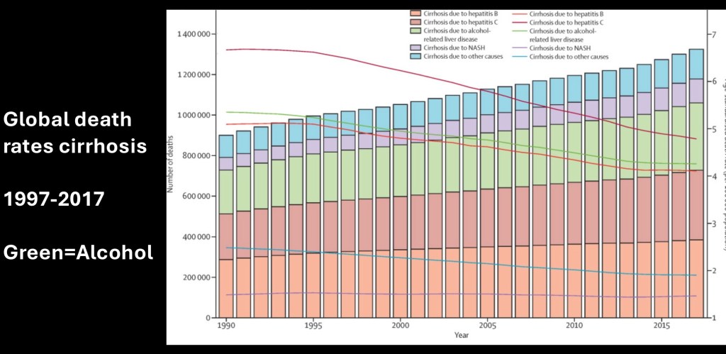 Global cirrhosis death rates by cause 1990-2017. Total number of deaths is largest for Hepatitis B and C. Alcohol is the third leading cause. Adjusted death rates are trending down. Alcohol is in green. Bars represent total deaths. Lines represent deaths/100,000 population.