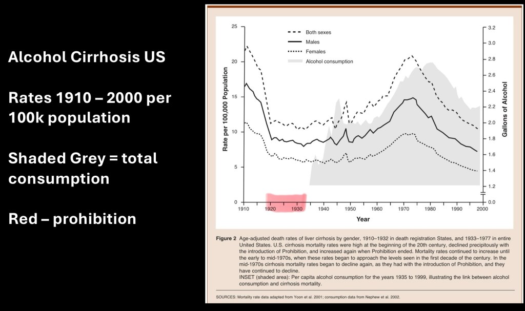 This graph represent historical death rates due to alcohol cirrhosis 1910-2000. The solid grey shaded area represents total national alcohol consumption.