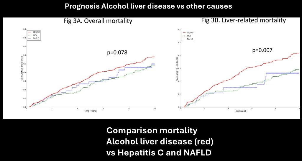 Alcohol related liver disease has a worse prognosis than cirrhosis due to hepatitis C and NAFLD. The three groups are similar in overall mortality over a 10 year period. The alcohol group (red) had a significantly higher liver related mortality rate.